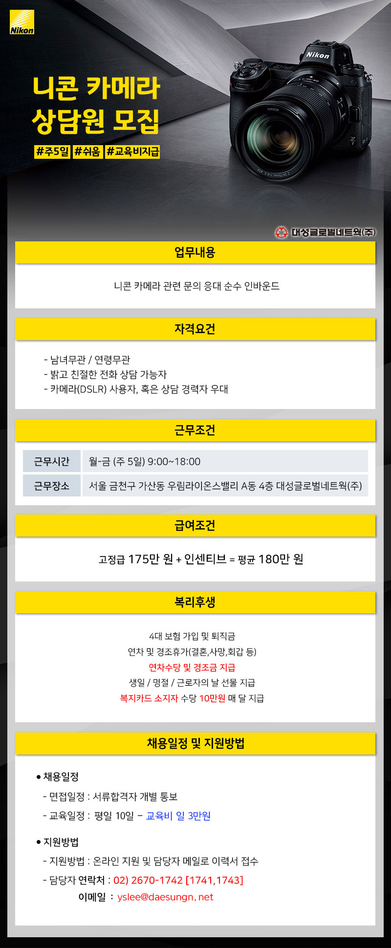 | 제목 | 니콘 상담원 5월 모집 | ||||
