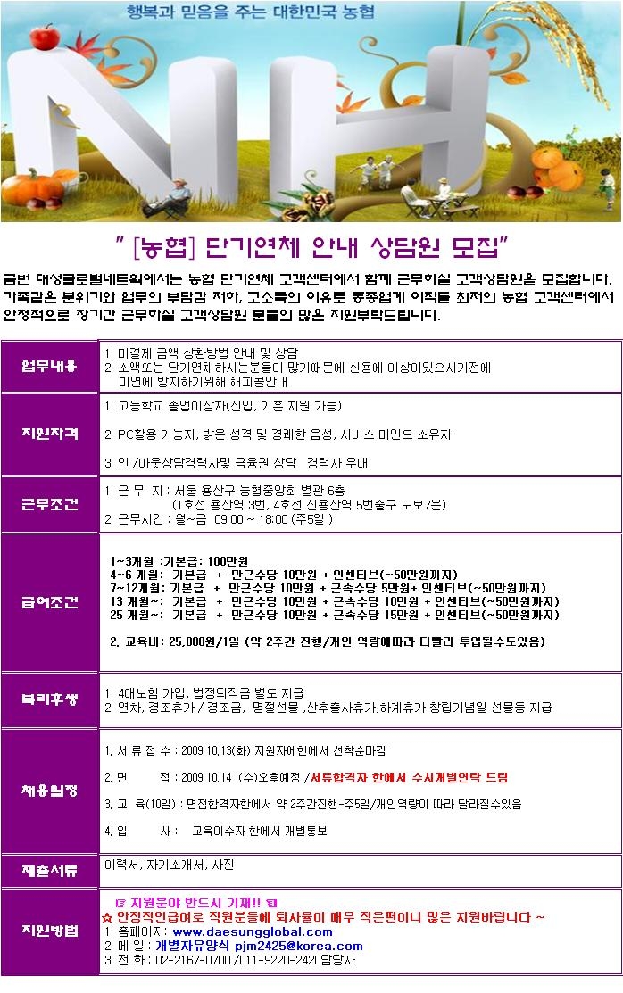 | 제목 | [농협/정규직/주5일] 단기미납 안내 상담원채용 | ||||