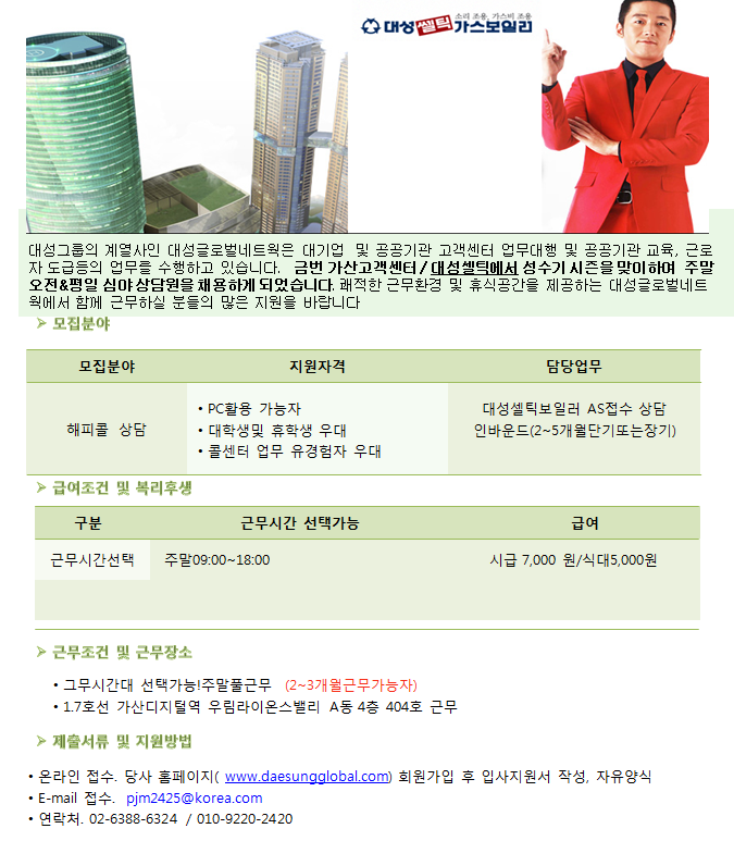 | 제목 | [주말아르바이트]대성셀틱 보일러 AS접수 상담원 채용 | ||||