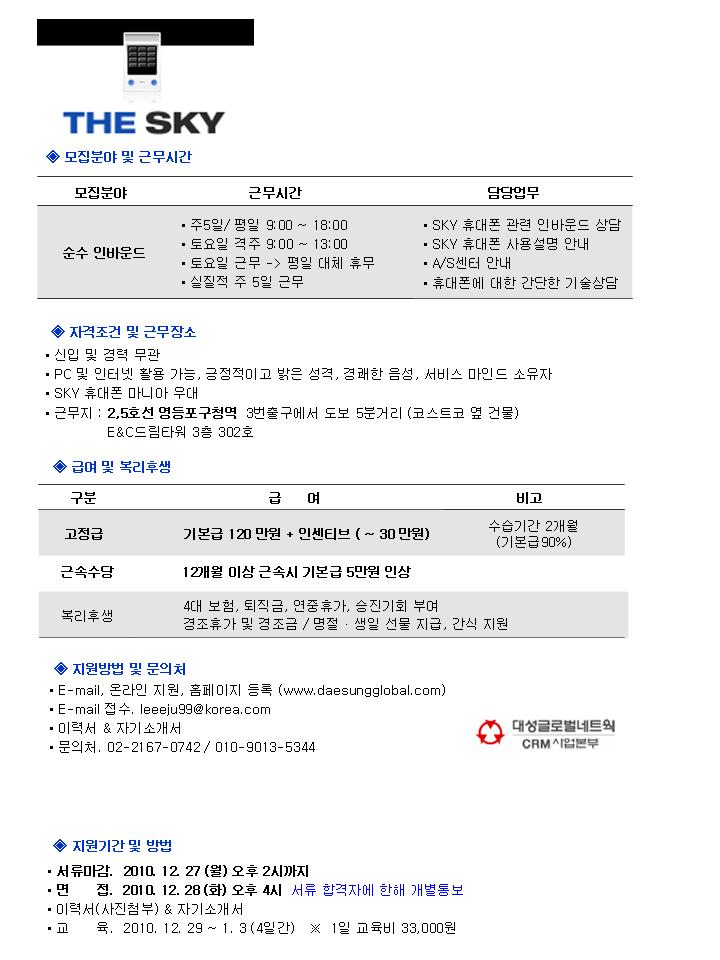 | 제목 | SKY(핸드폰)고객센터 순수인바운드 상담원 모집 | ||||
