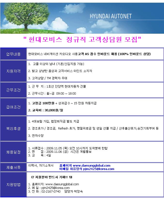 | 제목 | ▷안양역/주5일]현대모비스 AS 접수상담원 채용 | ||||