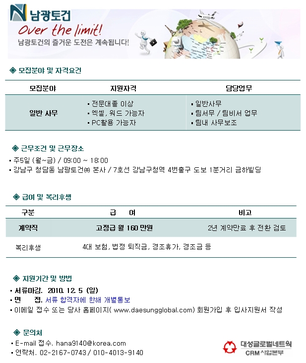| 모집분야 | 남광토건 | 업직종 | 일반사무 | 마감일 | 2010-12-02 |