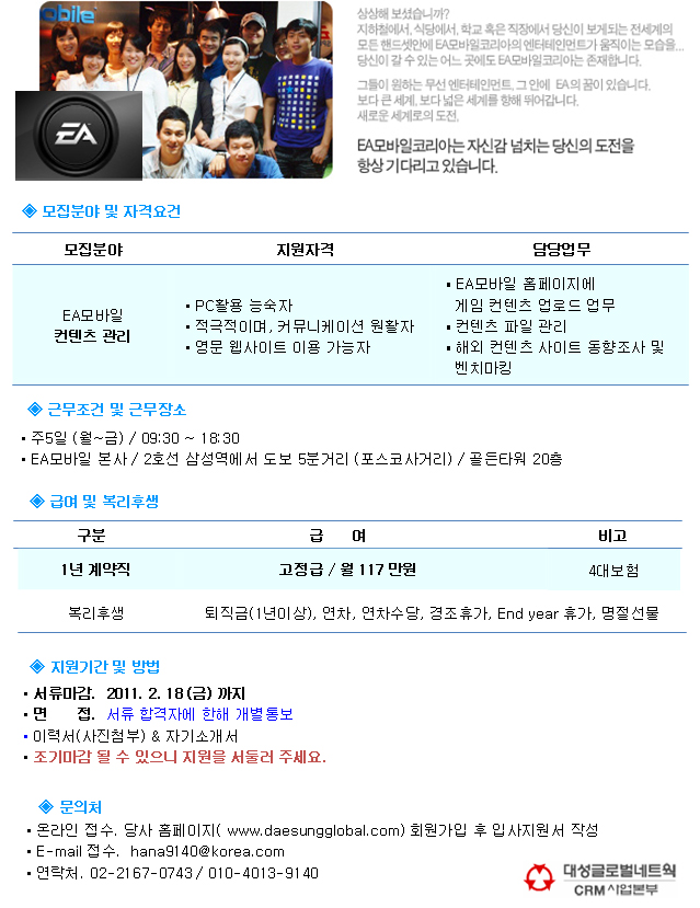 | 모집분야 | EA mobile | 업직종 | 웹서퍼 | 마감일 | 2011-02-16 |