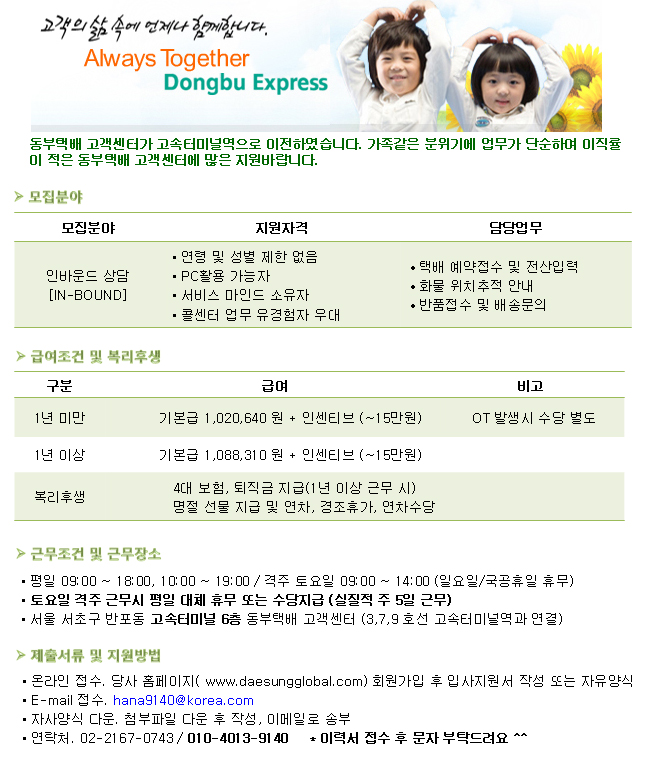 | 제목 | 고속터미널역] 동부택배 단순 배송접수 / 인바운드 상담 | ||||