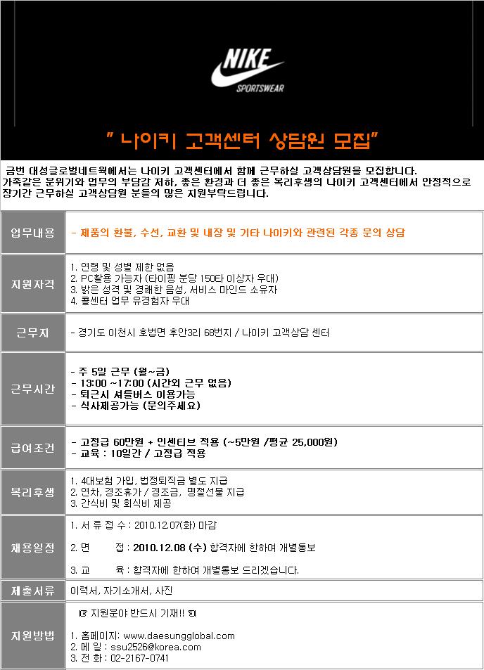 | 모집분야 | 나이키 | 업직종 | 인바운드 | 마감일 | 2010-12-08 |