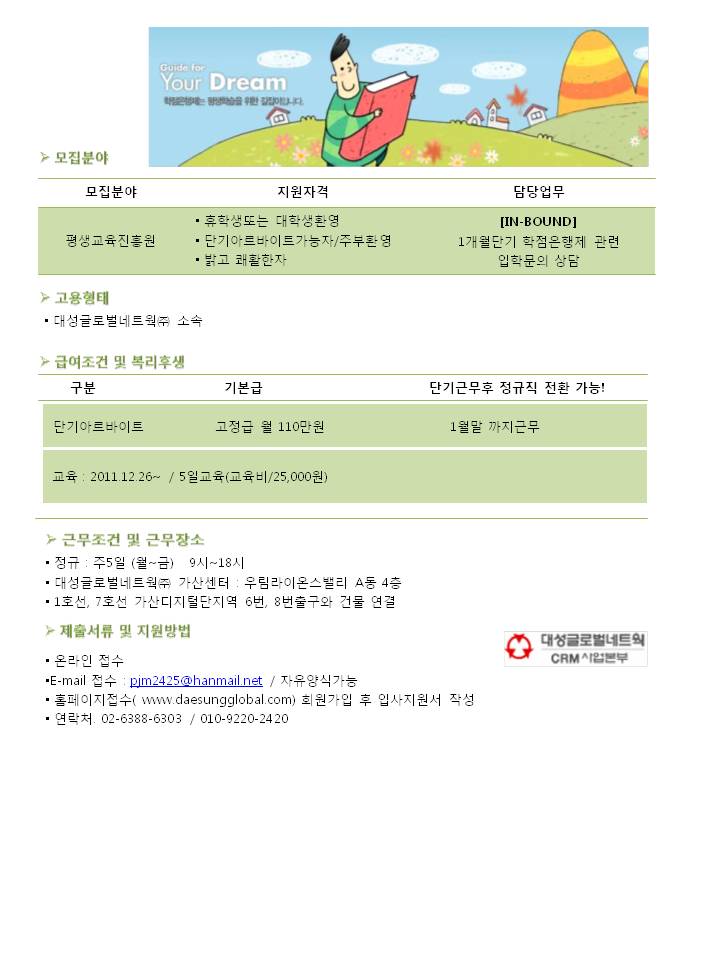 | 모집분야 | 평생교육진흥원 | 업직종 | 인바운드 | 마감일 | 2011-12-26 |