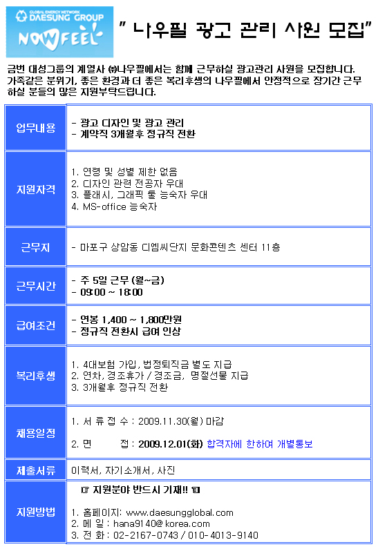 | 제목 | [대성그룹 계열사] 나우필 광고관리 사원 모집 | ||||