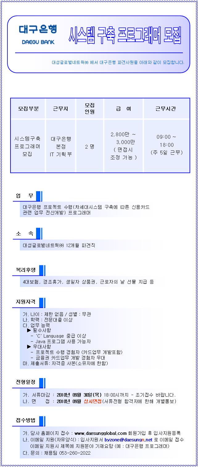 | 제목 | 대구은행 차세대 시스템구축 프로그래머 모집 | ||||