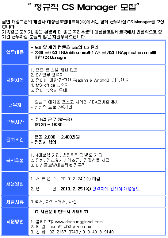 | 모집분야 | 대성글로벌네트웍 | 업직종 | S/V | 마감일 | 2010-02-24 |