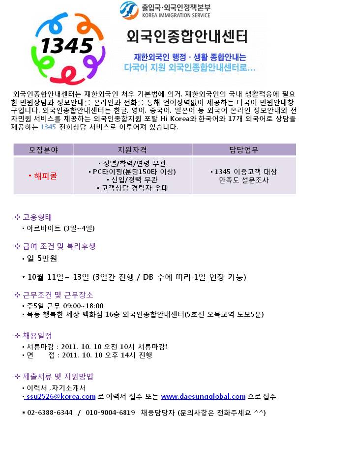| 모집분야 | 출입국관리소 | 업직종 | 고객상담 | 마감일 | 2011-10-10 |
