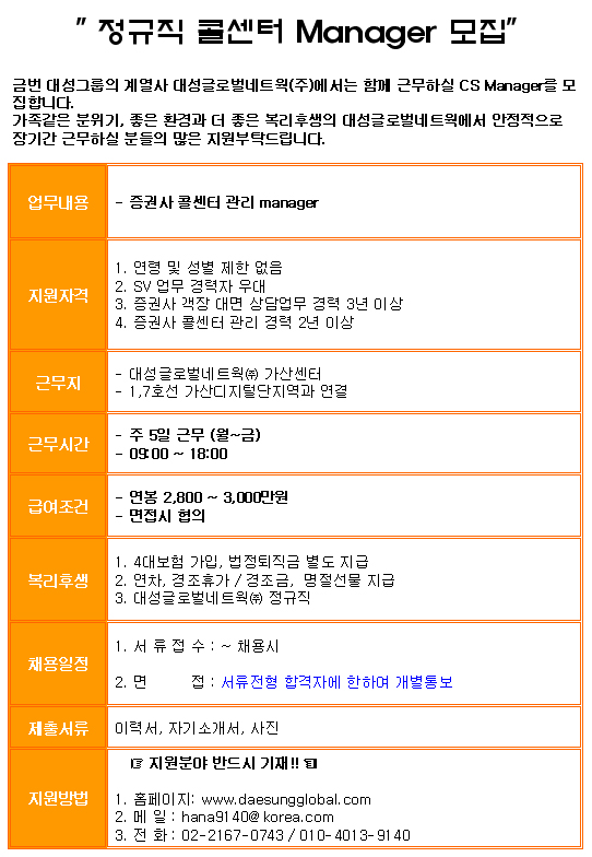 | 제목 | 정규직/증권사 콜센터 Manager 모집 | ||||