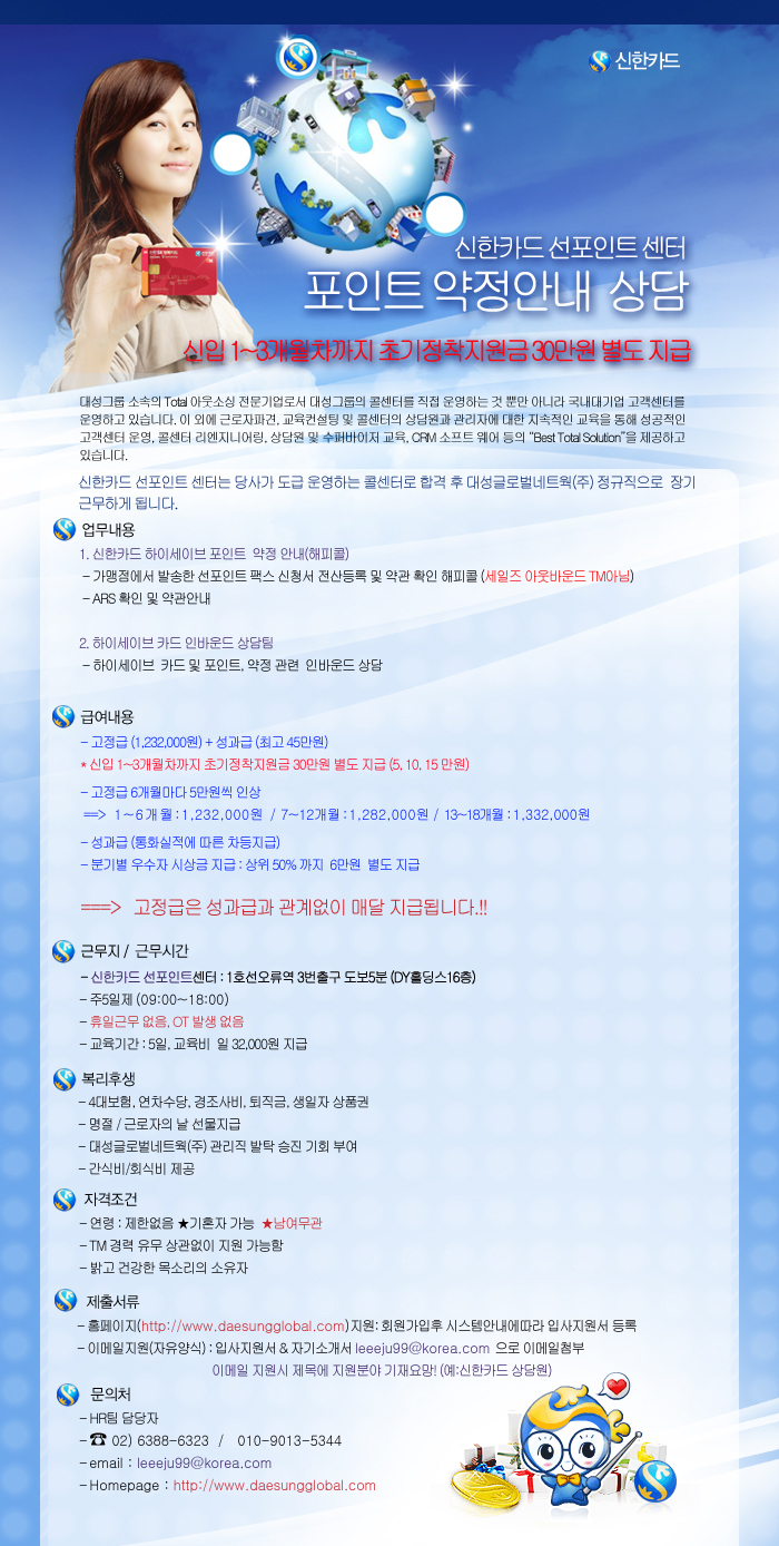 | 제목 | ◐신한 선포인트센터 팩스&ARS팀 상담원 채용 | ||||