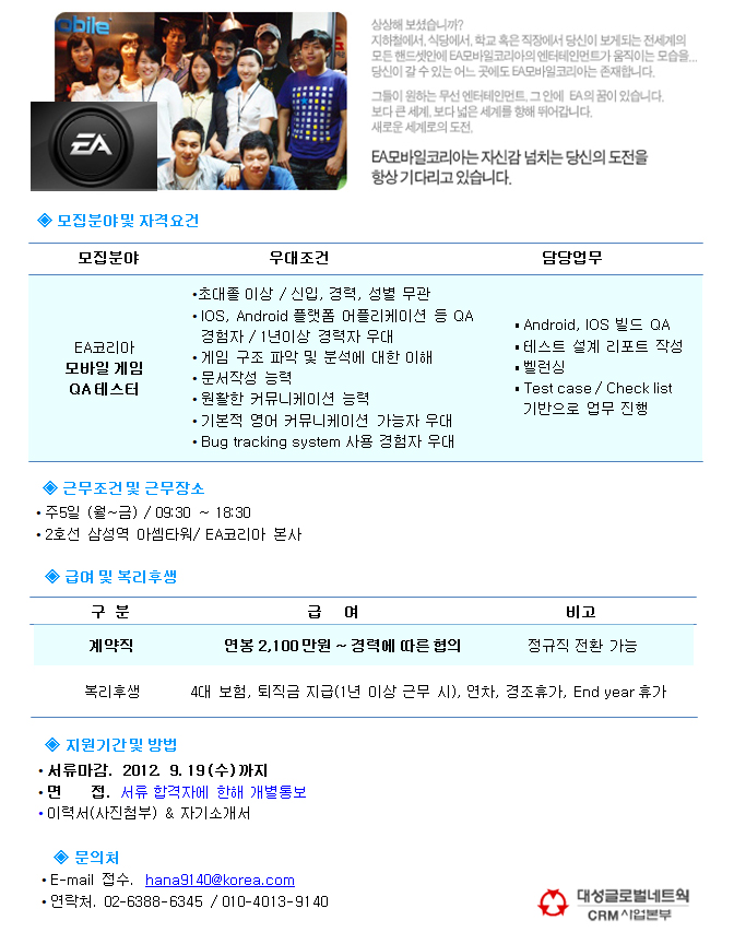 | 제목 | [외국계 게임사] EA코리아 모바일 게임 QA 테스터 | ||||