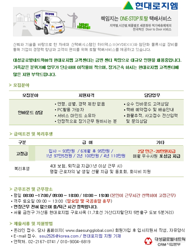 | 제목 | 가산/현대택배 단순접수 상담원 모집 | ||||