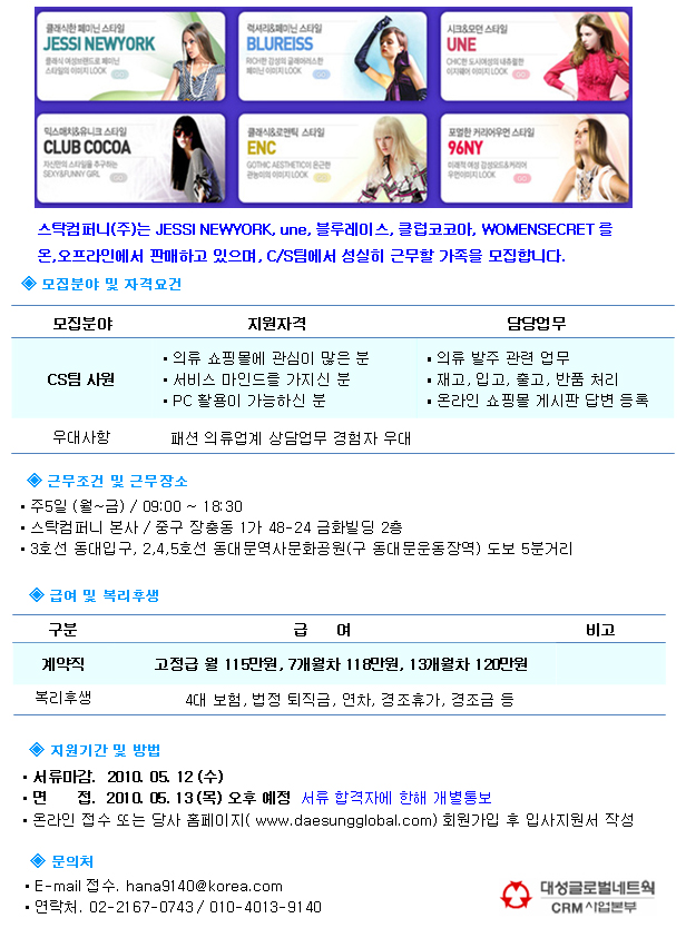 | 모집분야 | 스탁컴퍼니 | 업직종 | 인바운드 | 마감일 | 2010-05-05 |