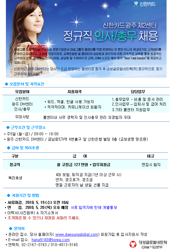 | 제목 | ◐광주/정규직]신한카드 DM센터 인사총무 사원채용 | ||||
