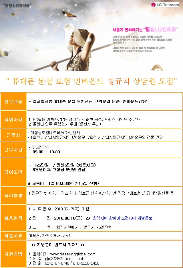 | 제목 | ▶주5일/정규직]휴대폰 분실관련 보험문의 인바운드 상담원채용 | ||||