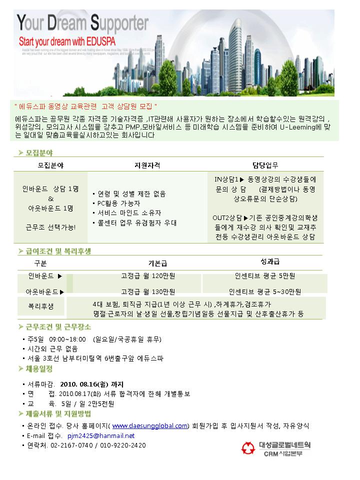 | 제목 | ▶정규직/주5일] 에듀스파 사이버강의수강생 상담원 채용 | ||||