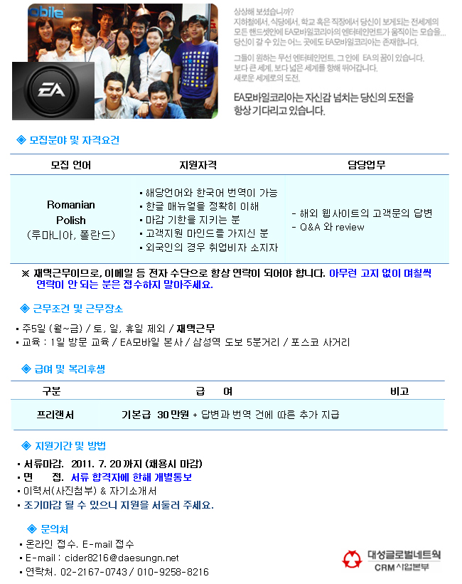 | 모집분야 | EA모바일 | 업직종 | 기타 | 마감일 | 2011-07-20 |