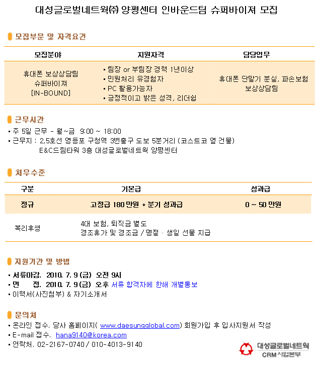 | 제목 | 대성글로벌네트웍(주) 양평센터 인바운드팀 팀장 모집 | ||||