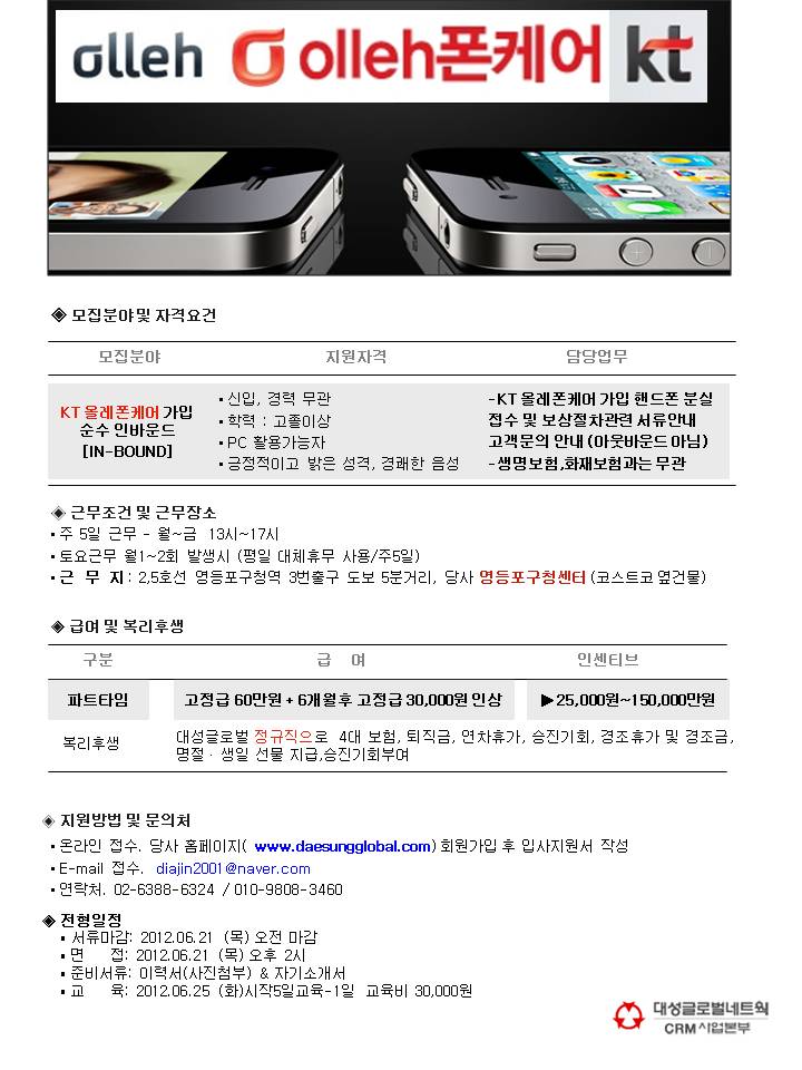 | 제목 | [오후파트직] KT 올레폰케어 분실접수 인바운드 채용 | ||||