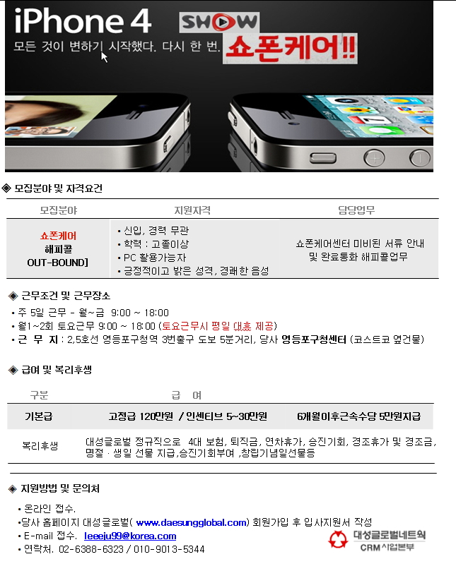 | 제목 | [정규/쇼폰케어]아이폰분실접수 해피콜 사원 채용 | ||||