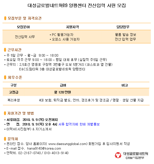 | 제목 | 대성글로벌 양평센터/ 단순 전산입력 사무원 모집 | ||||
