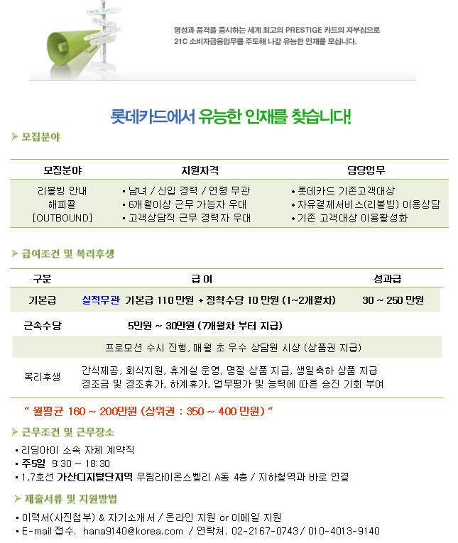 | 모집분야 | 롯데카드 해피콜 | 업직종 | 해피콜 | 마감일 | 2010-10-21 |