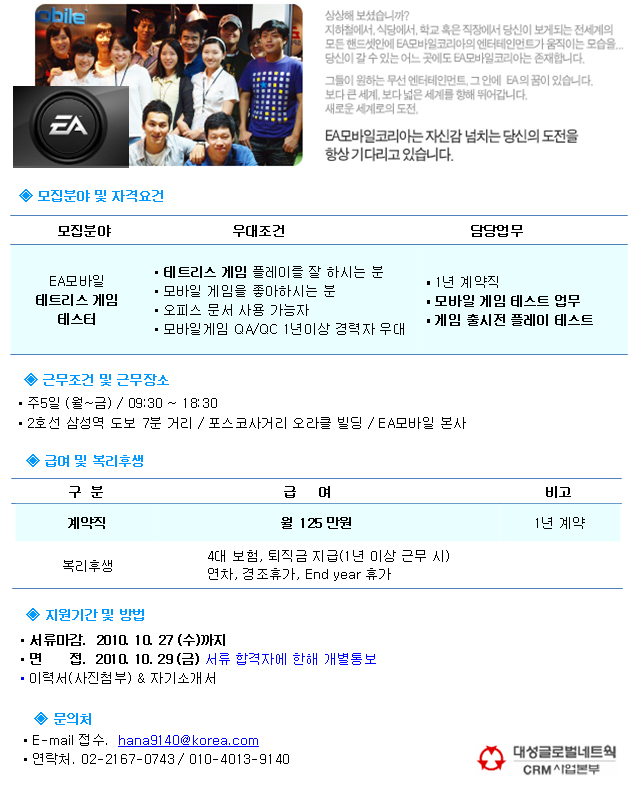 | 모집분야 | EA 모바일 | 업직종 | 기타 | 마감일 | 2010-10-25 |