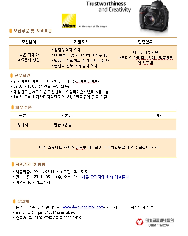 | 제목 | [단기아르바이트/5일] 니콘 카메라 단순 리서치 업무 | ||||