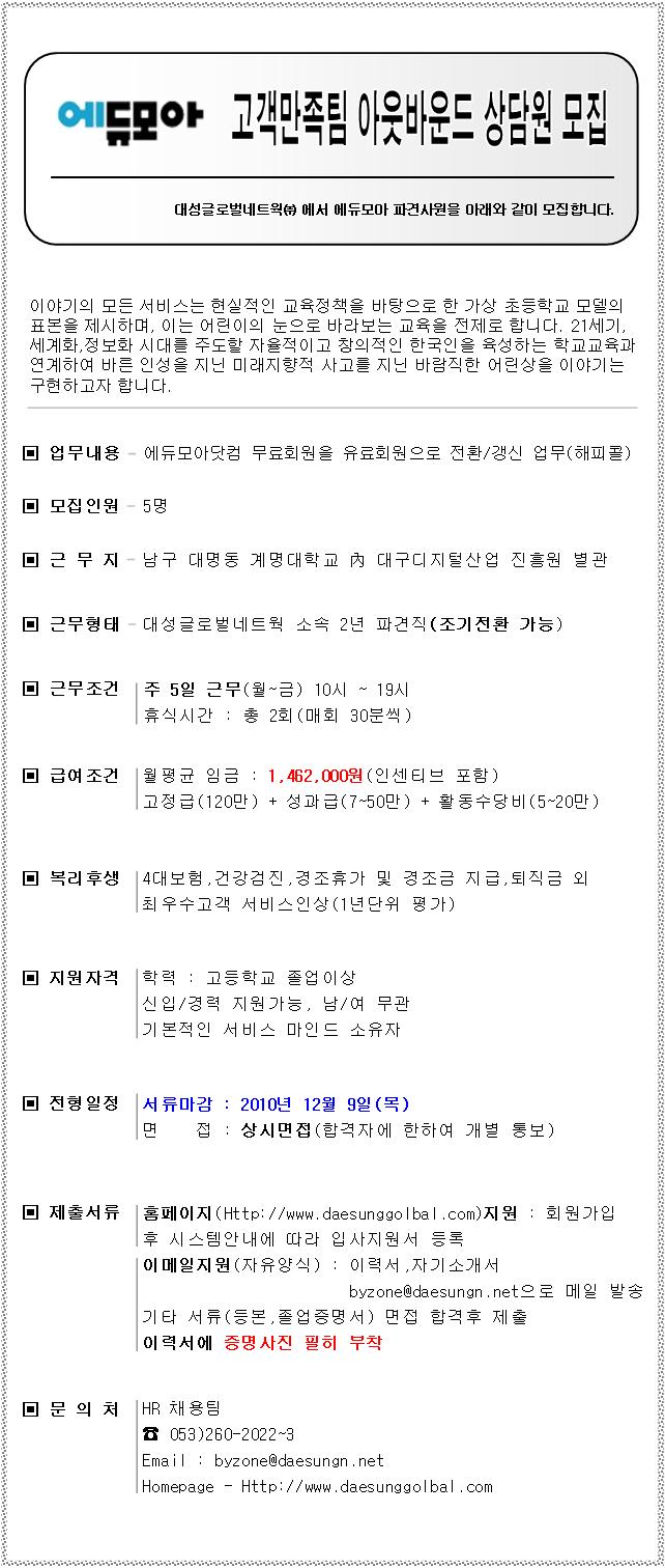 | 제목 | 에듀모아 고객만족팀 상담원 모집(조기전환 가능) | ||||