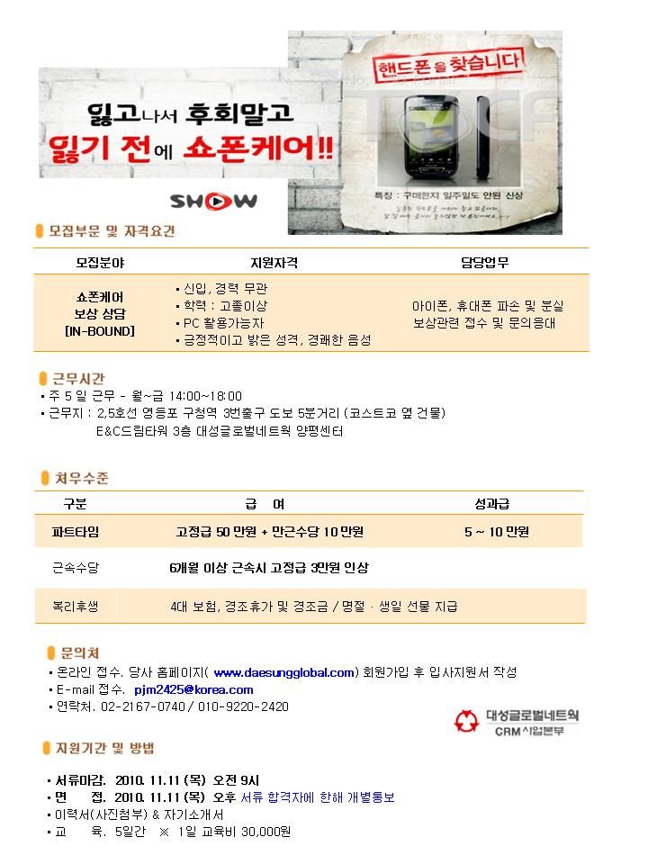 | 제목 | 주5일/파트] 아이폰 분실접수 인바운드상담원 채용 | ||||