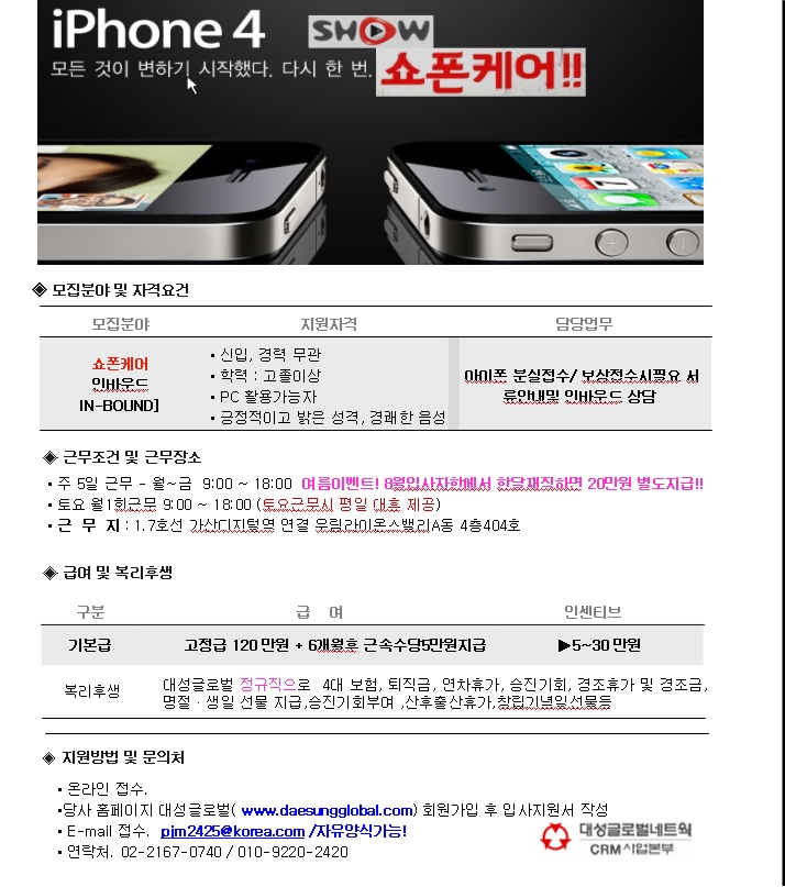 | 제목 | ▩가산센터오픈!/정규직]아이폰분실접수 인바운드 채용 | ||||