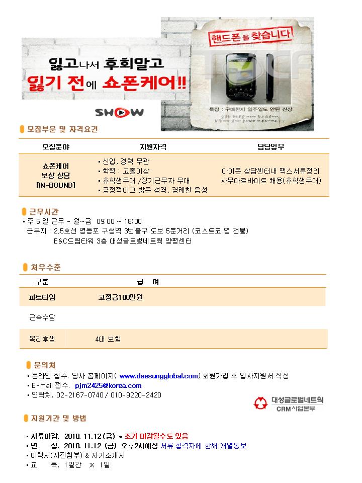 | 모집분야 | 사무지원 | 업직종 | 아르바이트 | 마감일 | 2010-11-12 |