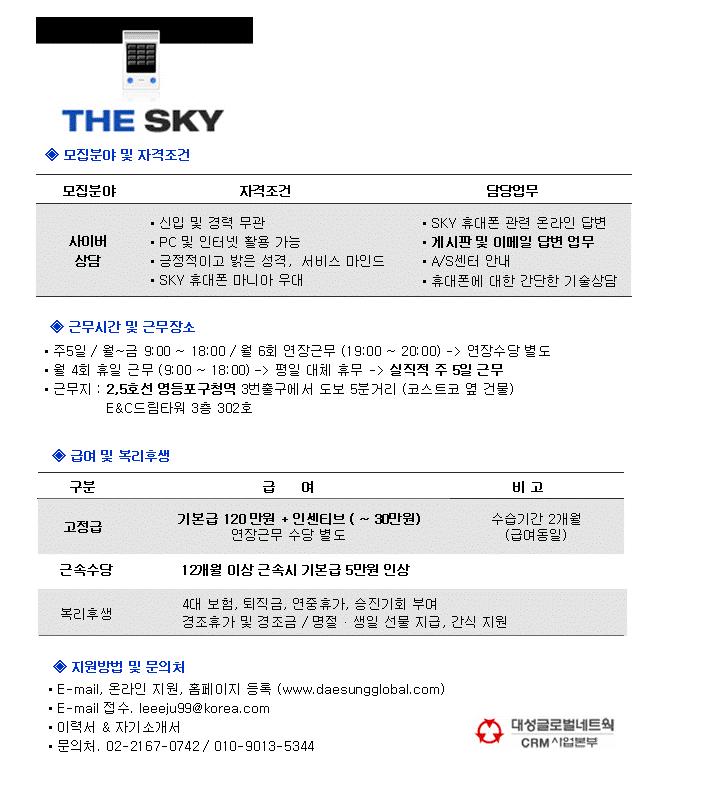 | 제목 | SKY(핸드폰)고객센터 사이버 상담원 모집 | ||||