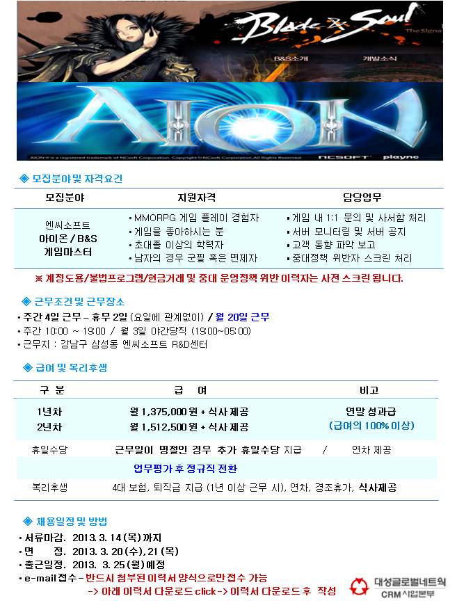 | 제목 | [엔씨소프트] 아이온, 블레이드 & 소울 게임마스터 모집 / 삼성동 | ||||
