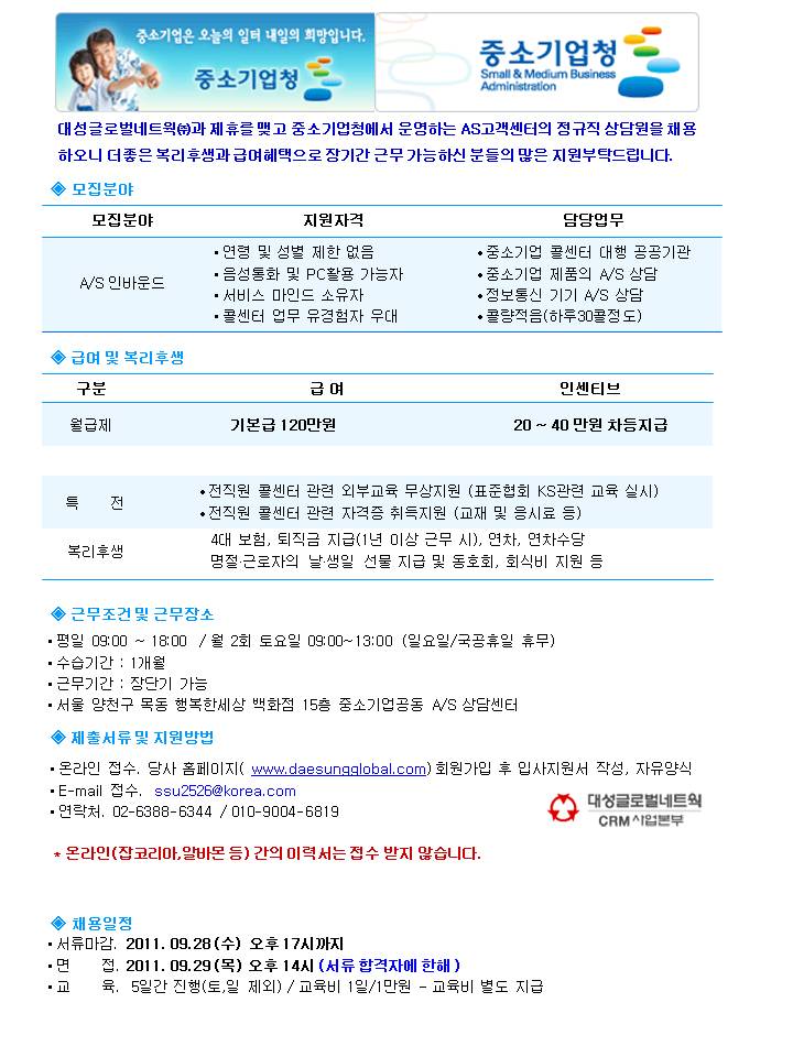 | 모집분야 | 중소기업공동 | 업직종 | 인바운드 | 마감일 | 2011-09-29 |