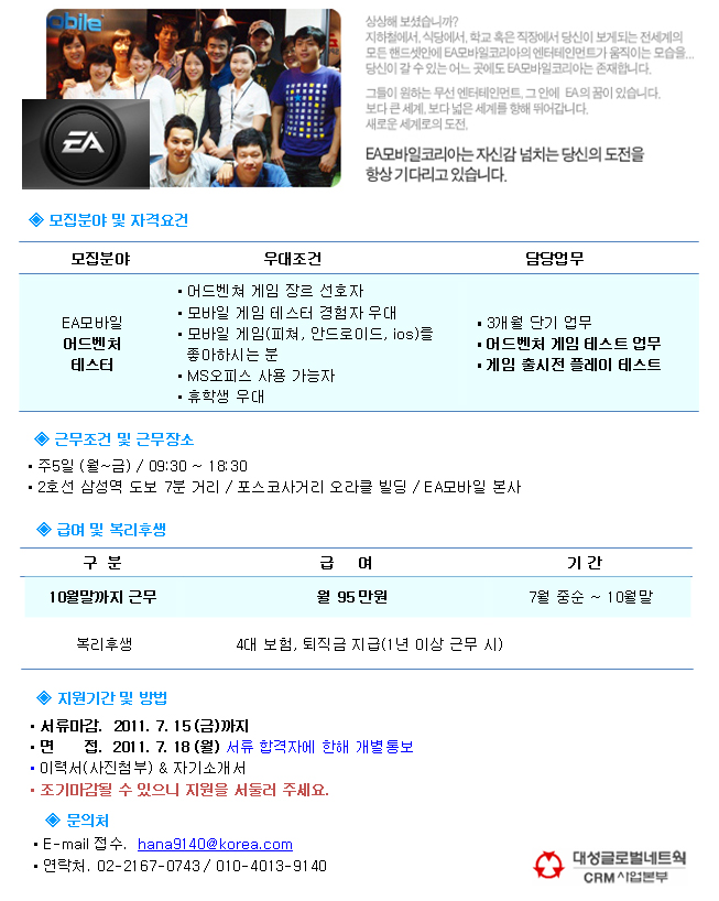 | 모집분야 | EA모바일-테스터 | 업직종 | 기타 | 마감일 | 2011-07-15 |