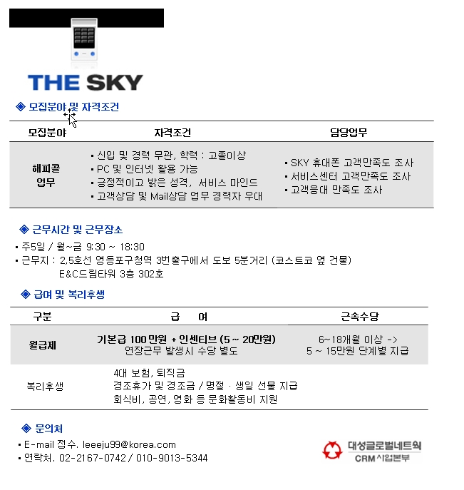 | 모집분야 | SKY 핸드폰 | 업직종 | 해피콜 | 마감일 | 2011-02-24 |