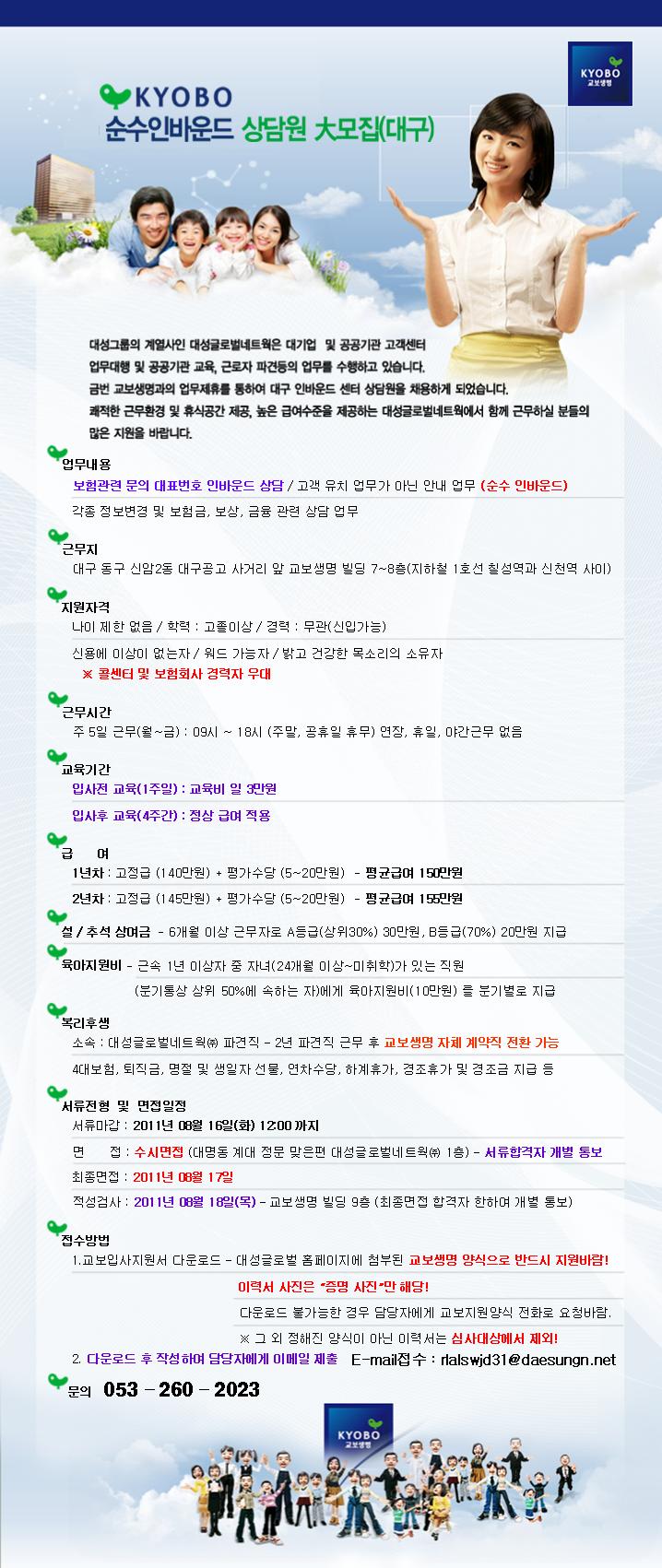 | 모집분야 | 교보생명인바운드 | 업직종 | 고객상담 | 마감일 | 2011-08-16 |