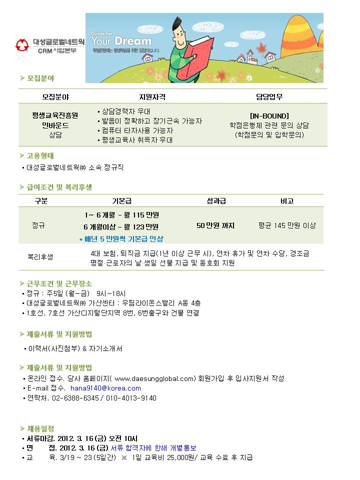 | 모집분야 | 평생교육 | 업직종 | 인바운드 | 마감일 | 2012-03-16 |