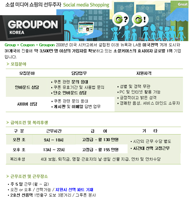 | 제목 | [주5일/선릉역] 소셜 커머스 / 인바운드 상담 / 게시판 답변 | ||||