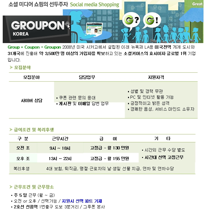 | 제목 | [주5일/선릉역] 세계최대 소셜 커머스 그루폰 / 게시판 답변 | ||||