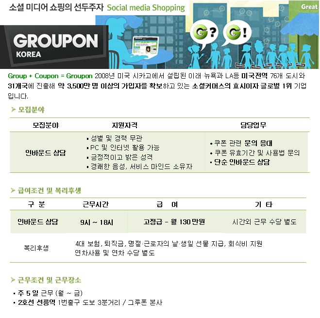 | 제목 | [주5일/선릉역] 세계최대 소셜 커머스 그루폰 / 단순 인바운드 상담 | ||||