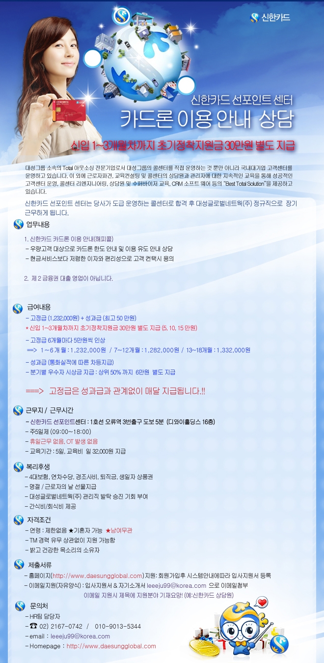 | 모집분야 | 신한카드 | 업직종 | 해피콜 | 마감일 | 2011-06-10 |