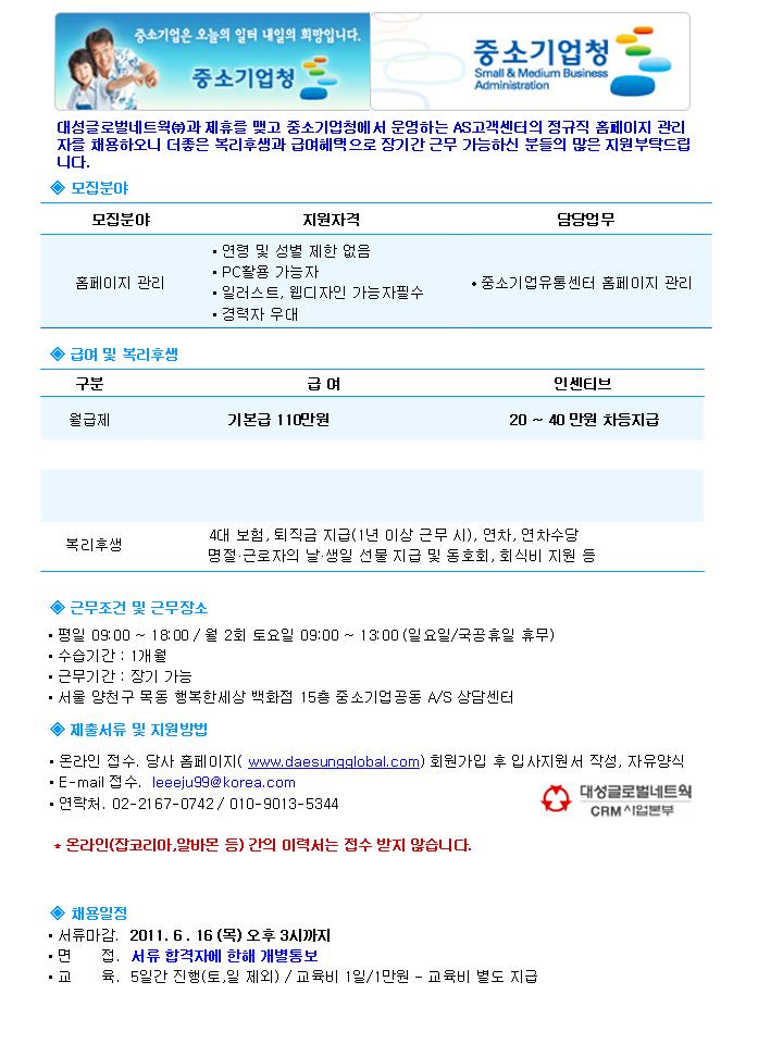 | 제목 | ▩중소기업청 공동 A/S센터내 홈페이지 관리자 채용(오목교)▩ | ||||