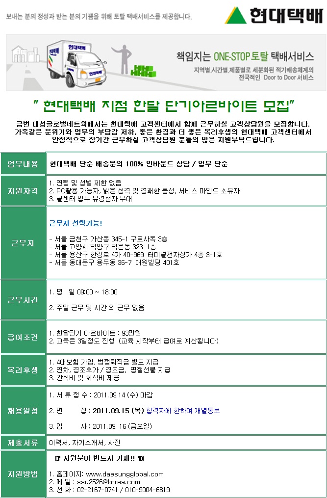 | 제목 | 현대택배 지점 아르바이트 (단순 상담업무) | ||||