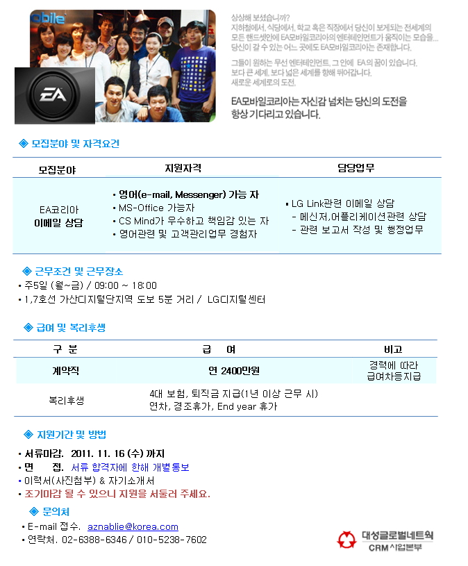 | 모집분야 | EA코리아 | 업직종 | 일반사무 | 마감일 | 2011-11-15 |