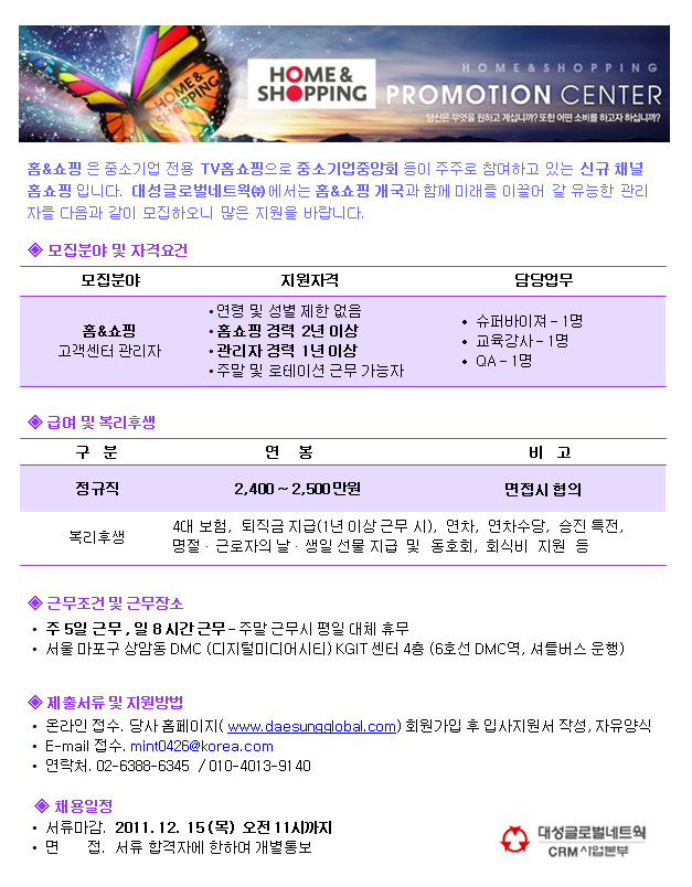 | 제목 | [정규직] 대성글로벌네트웍(주) 콜센터 관리자 채용 / 상암동 | ||||