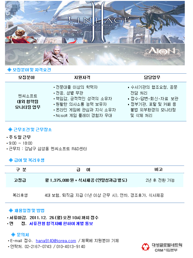 | 모집분야 | 엔씨소프트-대외협력팀 | 업직종 | 일반사무 | 마감일 | 2011-12-26 |